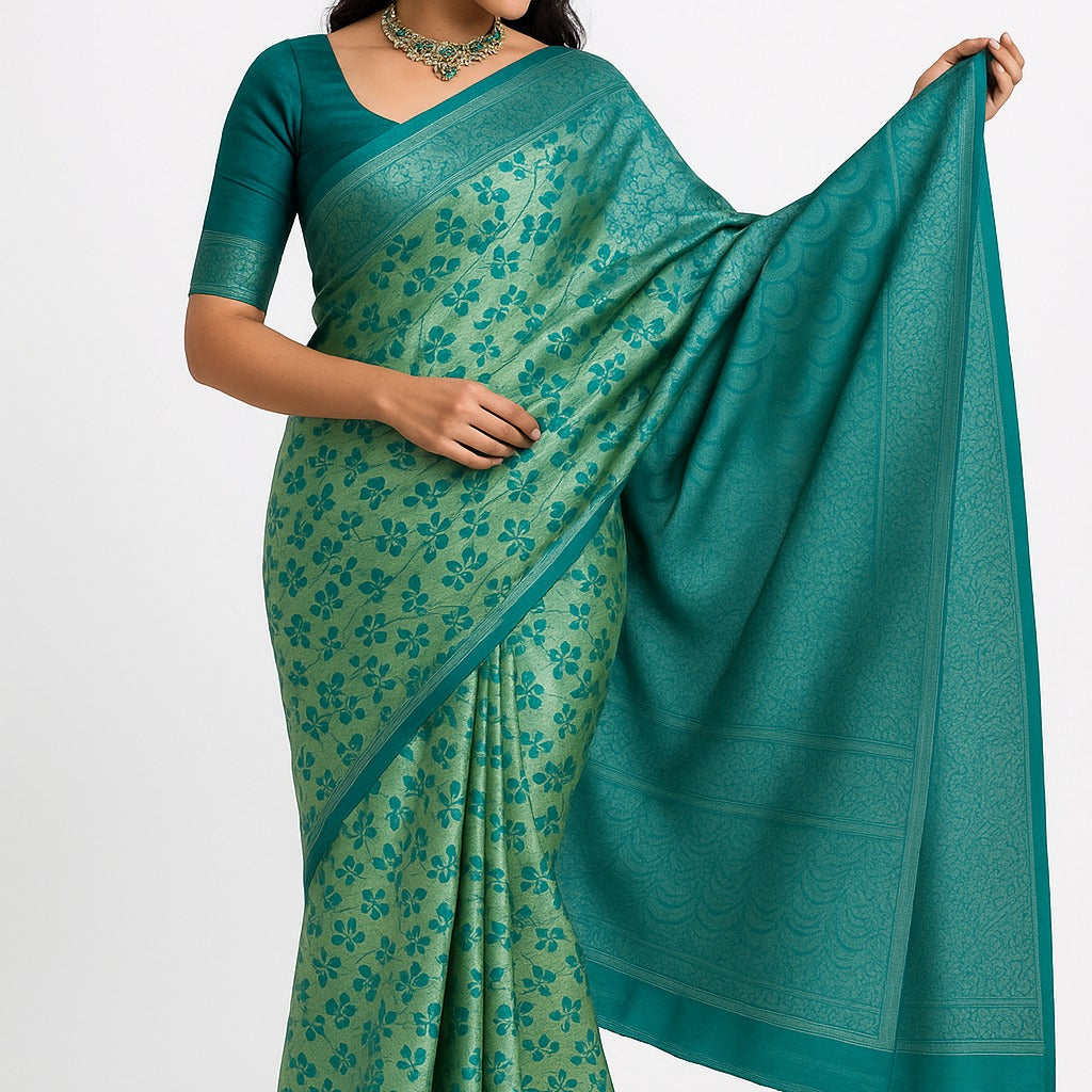 Chic Silk Teal & Mint Green Floral Saree with Unstitched Blouse Piece